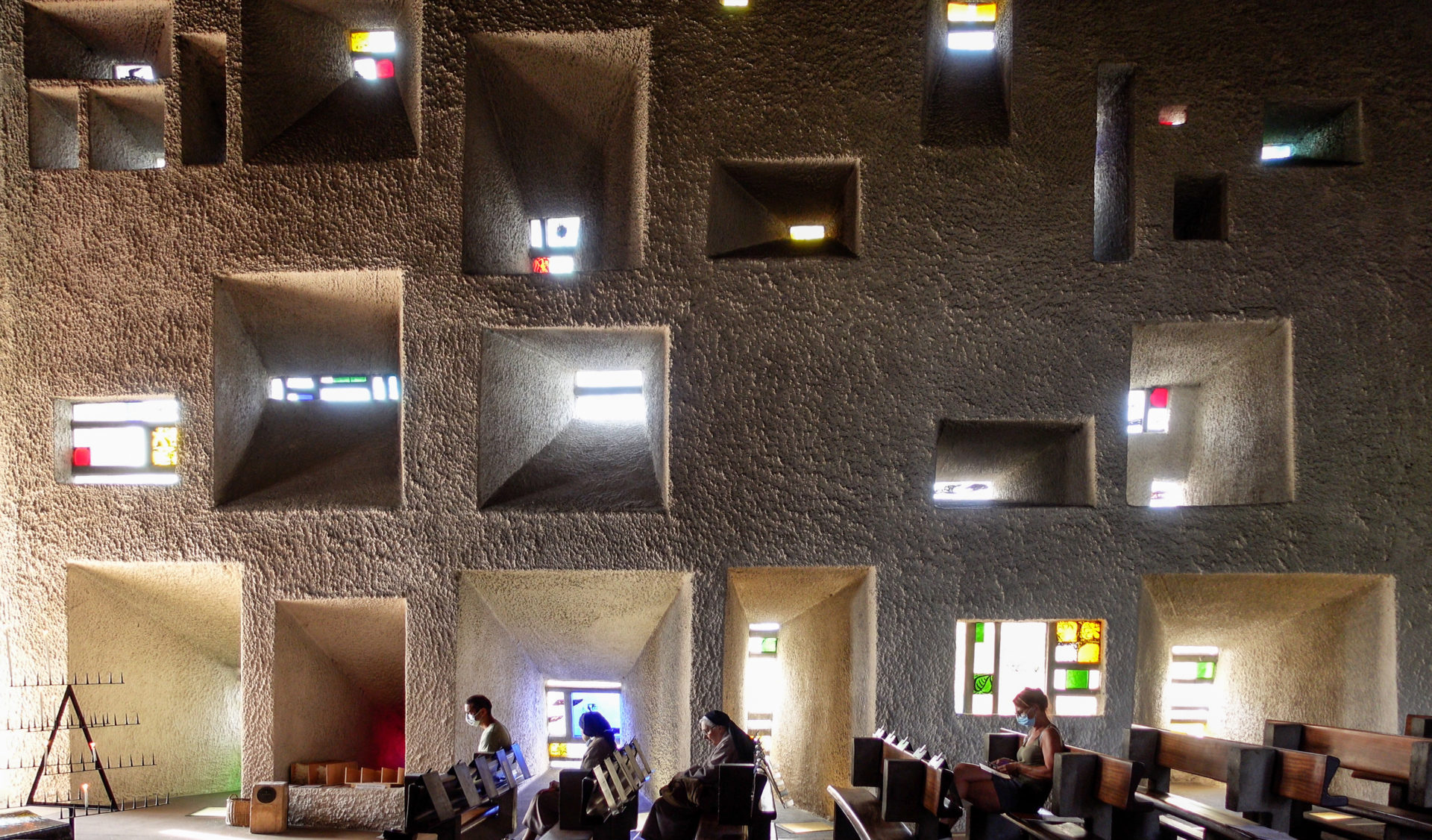 Interior de la iglesia Ronchamp, diseñada por Le Corbusier, reinterpretando los vitrales de las iglesias góticas para hacer arquitectura emocional. Wikiarquitectura