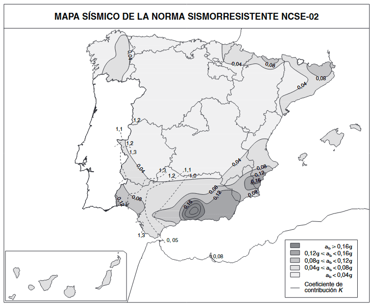 En España, la principal referencia ha sido durante años la Norma de Construcción Sismorresistente NCSE-02, aprobada en 2002. Esta norma, que puede descargarse desde la web del Ministerio, clasifica el territorio español en diferentes zonas según mediante un mapa de peligrosidad sísmica de España. Este mapa indica la aceleración sísmica básica que se puede esperar en cada área, el parámetro inicial de los cálculos estructurales antisísmicos.