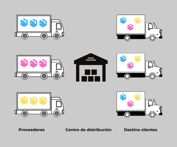 - Cross docking indirecto (o consolidado): se agrupan productos de distintos orígenes para formar cargas completas con destino común. Esto es útil cuando varios proveedores envían productos para una misma tienda; se consolidan en el centro de distribución y se despachan juntos.