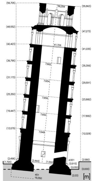 Además los cimientos de esta estructura solo tienen 3 metros de profundidad, poco resistentes para una estructura de 55 metros de altura. Todo esto provocó que la torre se inclinara primero hacia el norte y posteriormente hacia el sur.