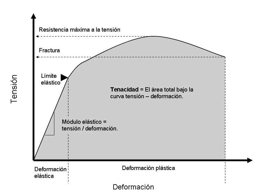 Siendo esto así, se trata de una magnitud que conjuga elementos tan importantes como la resistencia máxima a la tensión o la tenacidad, como aparece representado en la siguiente imagen, extraída de la importante revista de divulgación científica Naukas: