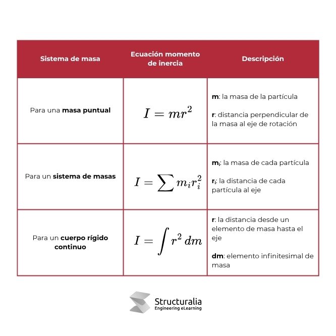 En estructuras, el concepto equivalente es la inercia de áreas (segundo momento de área), con unidades de m4, utilizada para evaluar la rigidez frente a flexión.