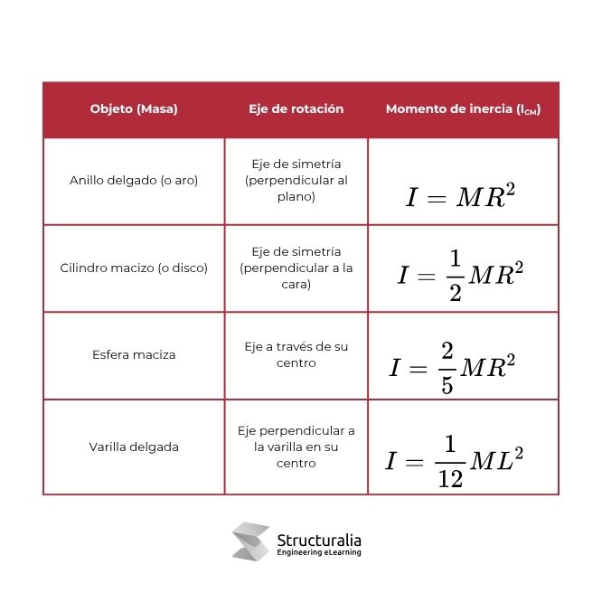 Para estos casos, el cálculo del momento de inercia respecto al centro de masa se realiza a través de fórmulas estándar que ya han sido deducidas mediante el cálculo integral y que se aplican directamente según la forma del cuerpo. ¡Mira estos ejemplos!