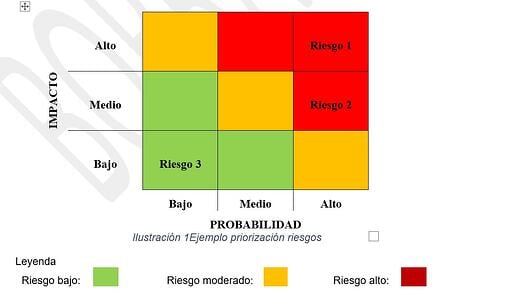 Se realizó una ponderación de riesgos basada en la metodología aplicada por el Ministerio de Economía y Finanzas del Ecuador. La metodología realiza una valoración entre 1 y 9 de los riesgos, entendiendo que 0 equivale a la no existencia del riesgo y 10 a un riesgo convertido en cierto y de alto impacto por lo tanto imposible de manejar o mitigar. La metodología se resume en el siguiente gráfico y consiste en multiplicar el número según la probabilidad asignada por el número del impacto asignado y obtener un resultado del riesgo: