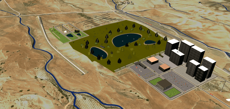 Figura 2. Ámbito de proyecto de la nueva urbanización. En primer plano, la línea de ferrocarril proyectada y al fondo, el libramiento carretero, todo modelado en Infraworks.