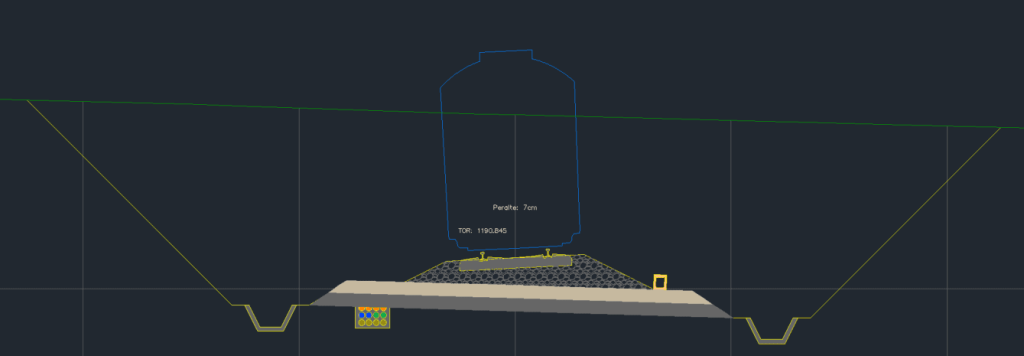 - Sección tipo: Se ha diseñado una sección tipo clásica de ferrocarril, a partir de la herramienta SubAssembly Composer de Civil 3D, incluyendo los elementos ferroviarios más comunes, de acuerdo con las directrices y dimensiones solicitadas por el cliente, tales como:
