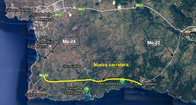 Para ello se ha realizado una nueva carretera de acceso a las Playas del Sur de la Isla de Menorca que conecte la carretera Me-24 (entre Ciudadela y Cala en Bosc) con la carretera Me-22 (entre Ferreries y Cala Galdana). Actualmente el acceso a las calas se realiza desde los diferentes caminos que parten de la carretera Me-1, no existiendo comunicación directa entre las calas. En su tramo final se ha planteado la ejecución de un puente para atravesar una zona de vaguada. La Imagen 1 muestra, en amarillo, la carretera a diseñar.