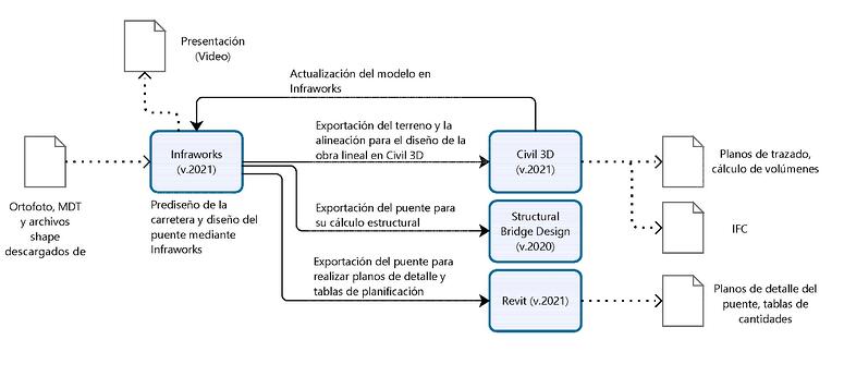 Lo que se ha perseguido con este proyecto ha sido analizar el flujo de trabajo a seguir para realizar una obra lineal, que incluye el diseño de un puente, y evaluar la interoperabilidad entre los diferentes softwares disponibles.