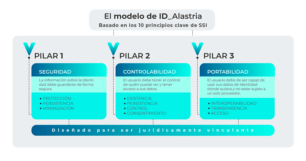AlastriaID es el proyecto de Identidad Digital de la Comisión de Identidad de Alastria. Su propuesta de Identidad Digital en Blockchain pretende proporcionar un marco de infraestructura y desarrollo, para llevar a cabo proyectos de Identidad Digital Soberana, con plena validez legal en la zona euro, siguiendo las siguientes premisas: