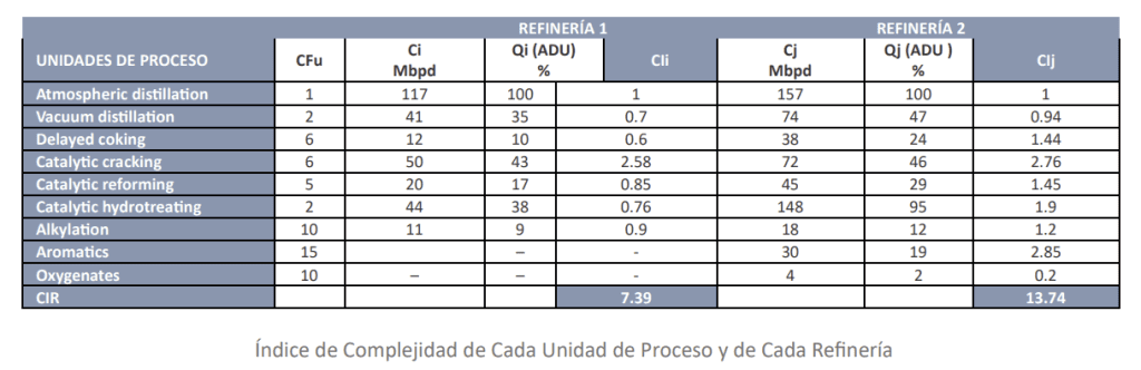 Según los datos tabulados, el valor del índice de complejidad para cada refinería se encuentra entre el rango 5<CIR<14), el cual es el establecido para la categoría de refinerías complejas. Sin embargo, también se puede observar que el mayor índice de la Refinería 2 denota mayor complejidad en su configuración, casi alcanzando la clasificación de “muy compleja” (CIR>14).