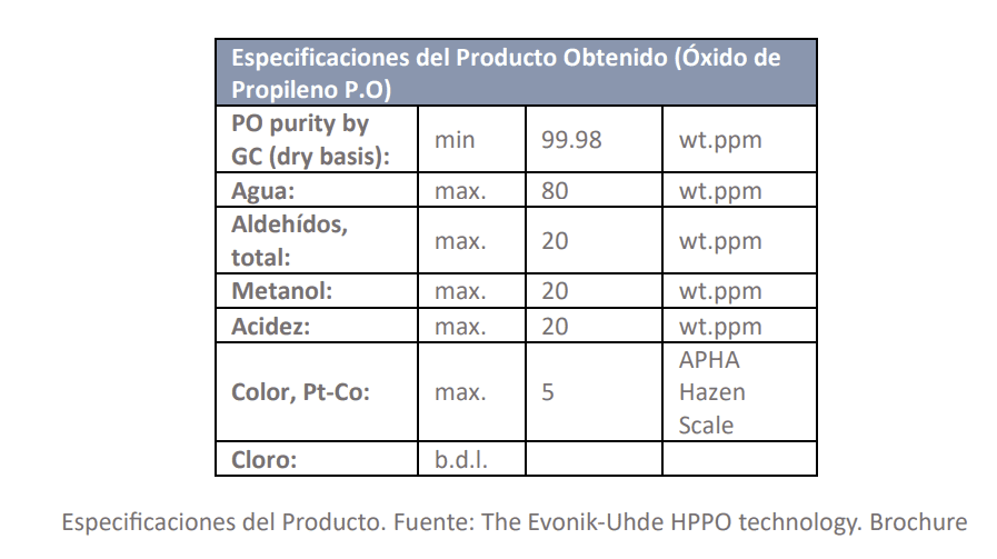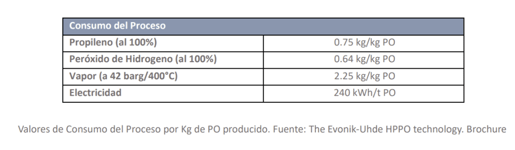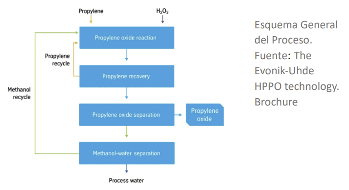 Acá, se decidió proponer como vía de producción la tecnología Evonik-Uhde. Tecnología HPPO (Hydrogen Peroxide to Propylene