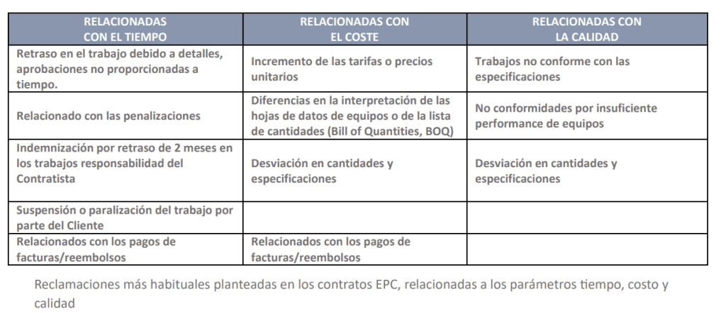 A continuación, se exponen algunos ejemplos de reclamaciones más habituales planteadas en los contratos EPC, relacionadas a los parámetros tiempo, costo y calidad. Algunas de ellas pueden estar relacionadas por su naturaleza, con más de un parámetro.