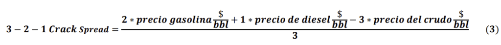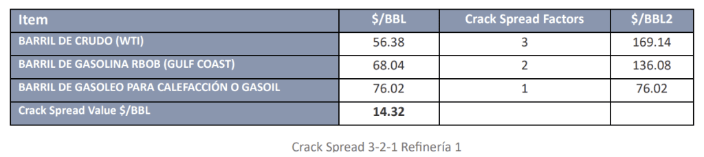 El Crack Spread es una medida simple que permite estimar el margen de refino en un momento y unas circunstancias dadas del mercado. Se basa en la diferencia de precios del mercado de uno o dos productos de la pizarra de producción y el precio de un barril de crudo. Existen diferentes combinaciones para el crack spread que pueden ser creadas en función de la configuración que se desee reflejar. Uno de ellos es el 1:1 el cual mide la diferencia entre el precio de un barril de crudo y el precio de un barril de gasolina, es común en refinerías que maximizan la producción de gasolina. El crack spread 3:2:1 el cual contrasta los precios de crudo, gasolina y diésel. Este último fue el aplicado al caso de estudio.