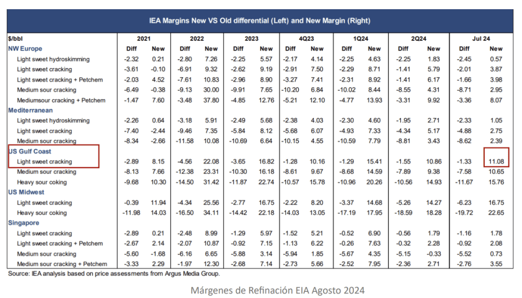 Por ejemplo, en EIA Methodology Notes Oil Industry and Markets Division Agosto 2024 se ha publicado la tabla de Márgenes de refinación de varias regiones, incluyendo la Costa del Golfo en Estados Unidos. Este, considera la configuración de la refinería, los rendimientos en productos (yields), costos de energía, costos de emisiones si aplica, así como tipo de crudo, costo y transporte.