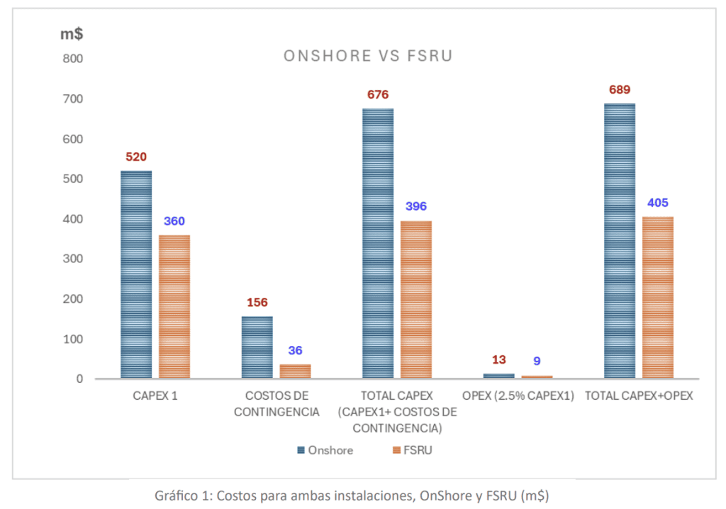 Para este caso, la instalación más económica en todos los aspectos considerados ha resultado ser la FSRU. Con un costo total de CAPEX+OPEX de 405 m$ vs 689 m$ de la instalación Onshore. Esto tiende a ser así, debido a que las unidades FSRU permiten mayor flexibilidad en cuanto a reubicación, arrendamientos, impuestos, servicios, permisos.