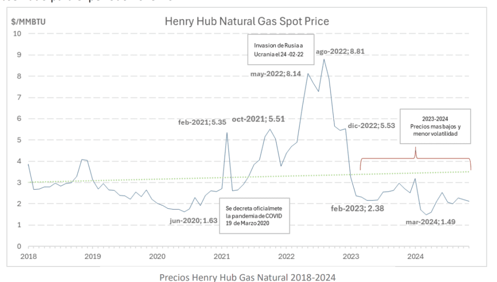 En este apartado se hizo el estudio del comportamiento de los precios de mercado del gas natural considerando un periodo de 6 años, desde el 2018 hasta el 2024. Se identificaron cuales fueron los valores mínimo y máximo de cotización de mercado del Henry Hub Natural Gas Spot Price (Dollars per Million Btu, (monthly), cuándo se produjeron y cuáles fueron las circunstancias coyunturales que los propiciaron. Por tanto, se desarrolló un análisis detallado, sin embargo, en este articulo solo citaremos algunos de los escenarios más conocidos durante tal periodo y el comportamiento observado para el periodo 2023-2024.