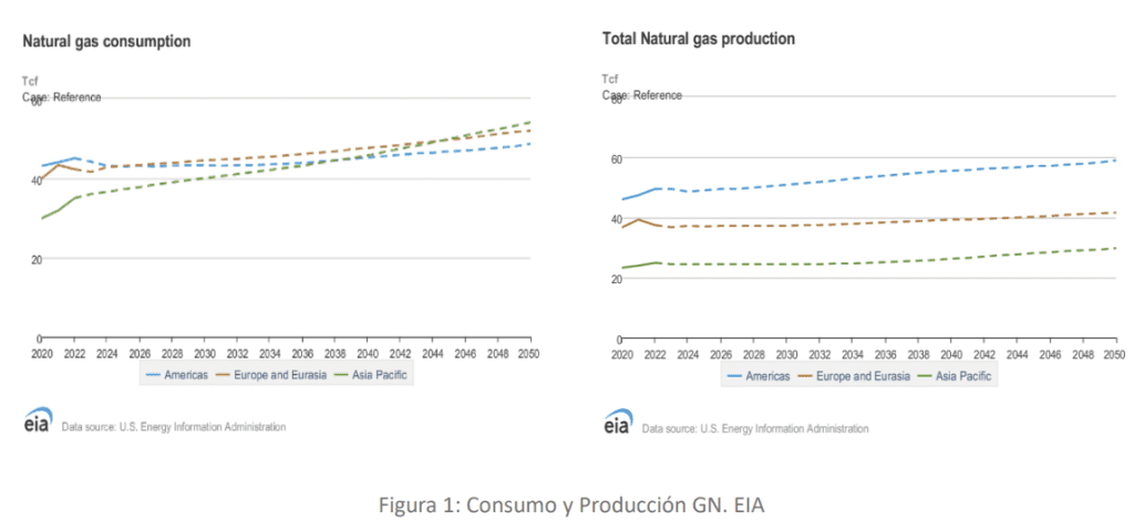 aumento con la finalidad de cubrir el consumo de los futuros años. Según el International Energy Outlook 2023 de EIA, debido a factores como el crecimiento económico en regiones como la India y China, se espera un aumento de su consumo para generar energía eléctrica. En la figura siguiente se puede apreciar los pronósticos, hasta el año 2050, de producción y consumo del GN, y se visualiza la brecha entre ambos, para Europa, Eurasia y Asia Pacífico. Es decir, el mercado por cubrir.